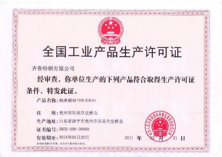 2011年3月,我公司軸承鋼產(chǎn)品榮獲全國工業(yè)產(chǎn)品生產(chǎn)許可。